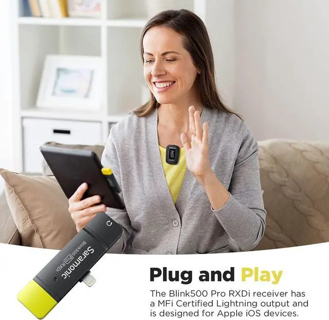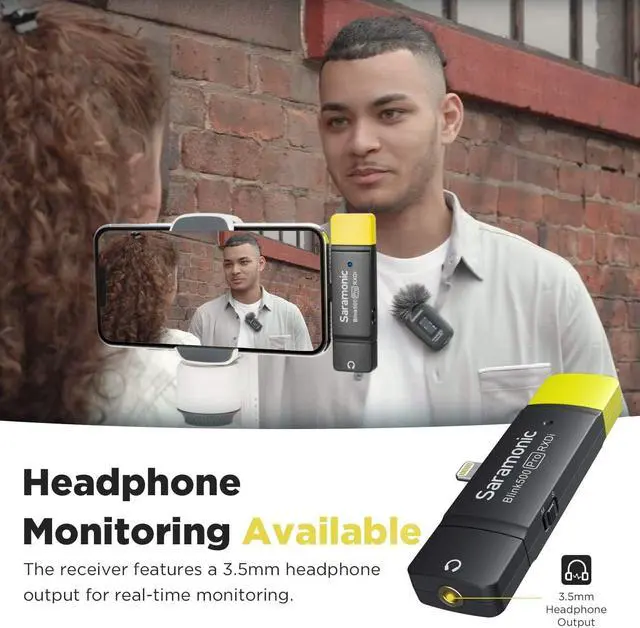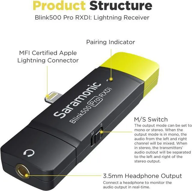 Mono/Stereo & Monitoring --- The Blink 500 Pro RXDI receiver has a MFi Certificated lightning end, simple plug & play operation. Featured a 3.5mm headphone output for real-time monitoring, selectable Mono/Stereo switch. Pls Notes --- It will only work if you have it in camera mode. Open your Camera first and then plug the lightning receiver into your phone.