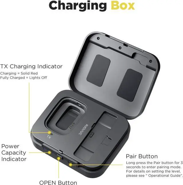 Battery Case & Charging --- The wireless transmitters and receiver deliver a remarkable 8-hours of run time on a single charge and feature quick charging. The supplied charging case allows you to charge the wireless microphone system anywhere and can be recharged or powered via the USB-C DC 5v port using USB-A chargers and battery packs.