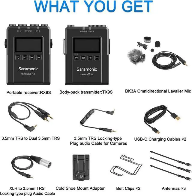 Includes the DK3 High-Quality Lavalier for Premium Sound with vital accessories: 2x mic clips and a cable wrap, with a metal-mesh, 2x foam and 2x furry high-wind windscreens all included