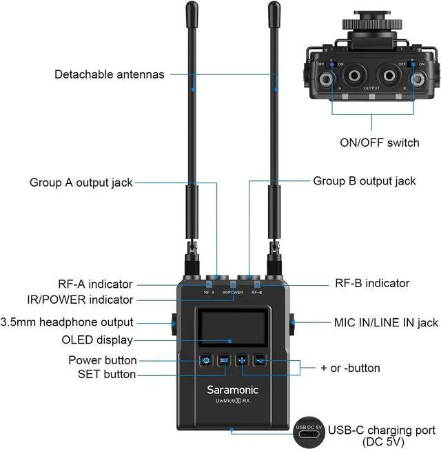 Dual Receiver features headphone out, mic or line-level input, 2x dedicated outputs with 4x output cables, up to 2000mAh 8-hour Li-Ion power with USB charging/powering and more