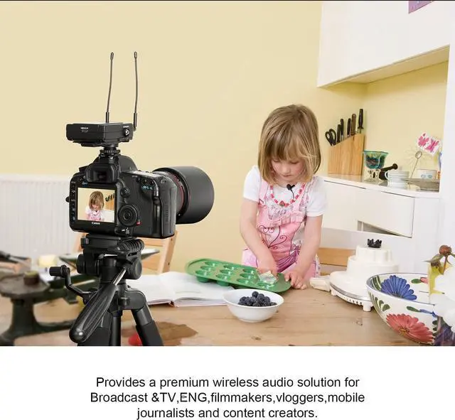 Advanced wireless UHF lavalier microphone kit with a dual-channel camera-mountable receiver that provides premium, broadcast-quality sound and can expand by adding a 2nd transmitter