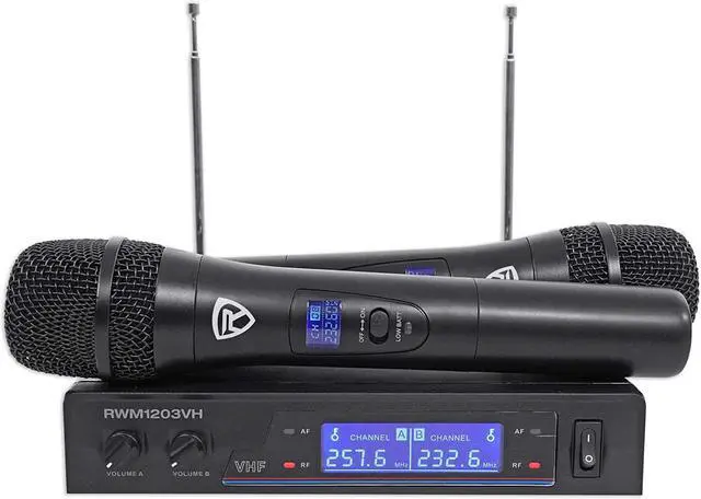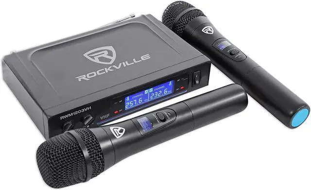 RockvilIe RWM1203VH Wireless (2) HandHeld Microphones 4 Church Sound Systems, Large display on receiver + digital display on each mic, Each mic is large and solid with a nice weighted feel, Improved high performance wireless handheld microphone capsule, Includes transmitter with two handheld, high sensitivity, unidirectional, wireless cardioid microphones, Featuring a dual filter design to limit feedback and interference