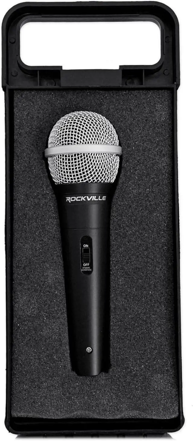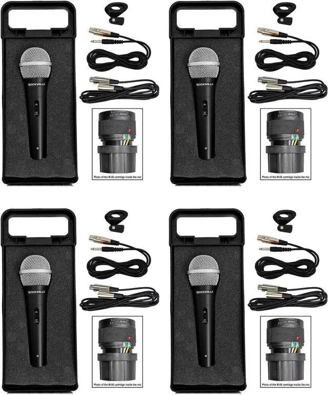 Package Includes: (4) Rockville RMC-XLR High-End Metal DJ Handheld Wired Microphones, each with (2) Cables (XLR to ¼ and XLR to XLR), Mic Clip, Plastic Carry Case, and Owners Manual (Total: 4 Mics, 8 Cables)
