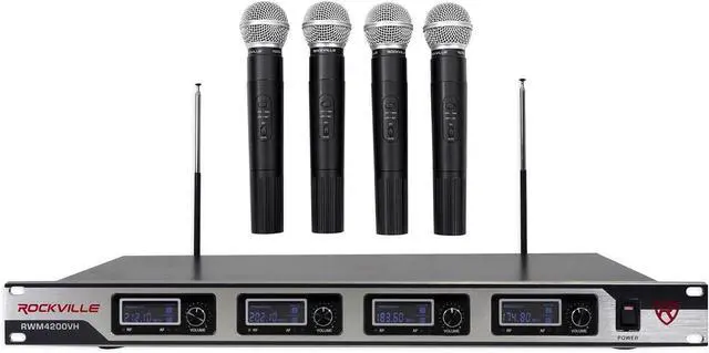Features of RWM4200VH: RockvilIe RWM4200VH Wireless (4) HandHeld Microphone System, Rack Mount Ears Included, Digital display on receiver and on each microphone, High performance wireless hand held microphone system