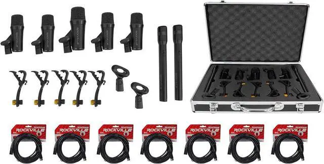 Package Includes: (1) Rockville PRO-D7 KIT 7 Mic Drum Kit w/Bass+Snare+Condenser Overhead Microphones. (7) Rockville RCXFM20E-B 20 Foot Female to Male XLR Mic Cable Black 100% Copper. Whats Included: (1) Bass drum mic. (4) Snare drum mics. (2) Overhead condenser mics. (7) Mic clips. (1) Aluminum travel/protective case with foam. Manual. Warranty card. Bass Drum Microphone: Steel grill. Aluminum body. Zinc alloy hardware. Fits any mic stands. Anti-wind filter inside the grill
