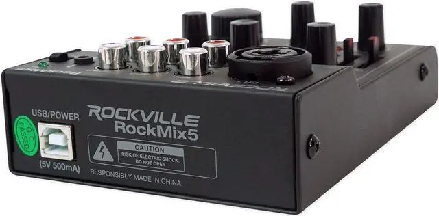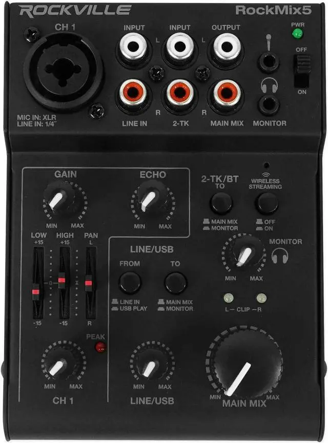 Mixer Features: RockMix 5 brings USB DAW recording, Bluetooth playback and a low-noise super-linear mic pre-amp in a compact steel chassis. Channel 1 offers a combo XLR/¼" input with 2-band British-style EQ, pan, echo and peak/clip LEDs. Two stereo channels, one mono channel, extra 3.5mm mic input, RCA main mix output, bus power (5V/500mA) and included AC adapter for flexible powering.