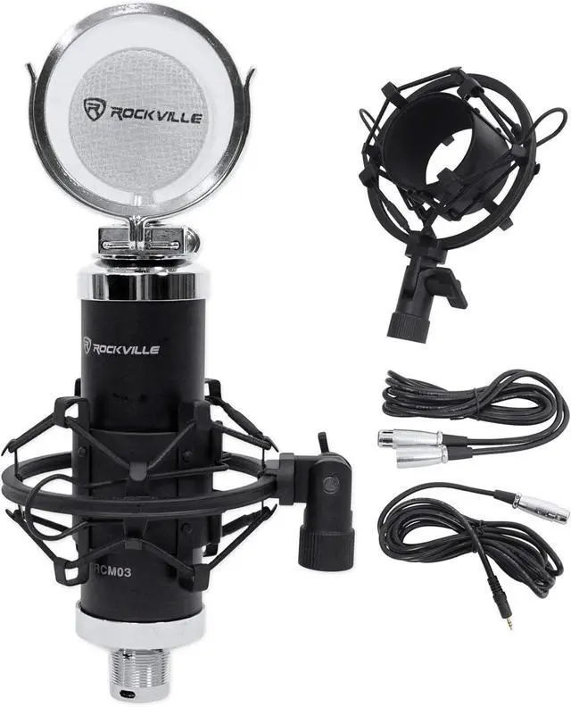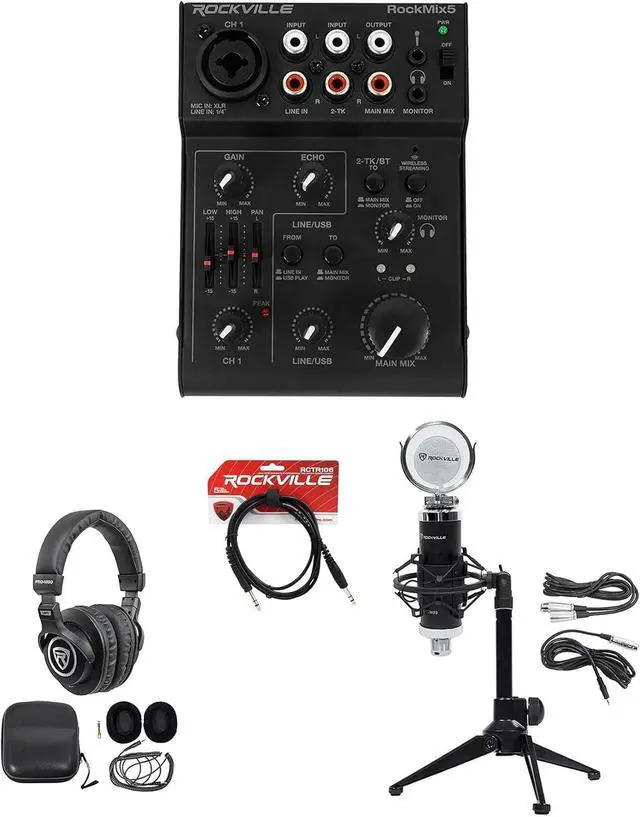 Package Includes: (1) Rockville RockMix 5 Channel Pro Mixer w/USB Interface, Bluetooth, Echo, EQ; (1) Rockville PRO-M50 Studio Headphones w/ Detachable Coil Cable, Case+Extra Ear Pad; (1) Rockville RCTR106B 6' 1/4'' TRS to 1/4'' TRS Balanced Cable, Black, 100% Copper; (1) Rockville RCM03 Pro Studio Recording Condenser Microphone Mic+Metal Shock Mount; (1) Rockville RDTS Adjustable Height Studio Desktop Tripod Microphone Stand+Mic Clip