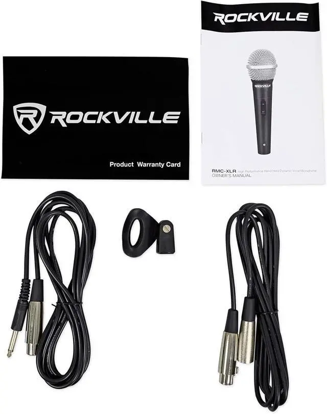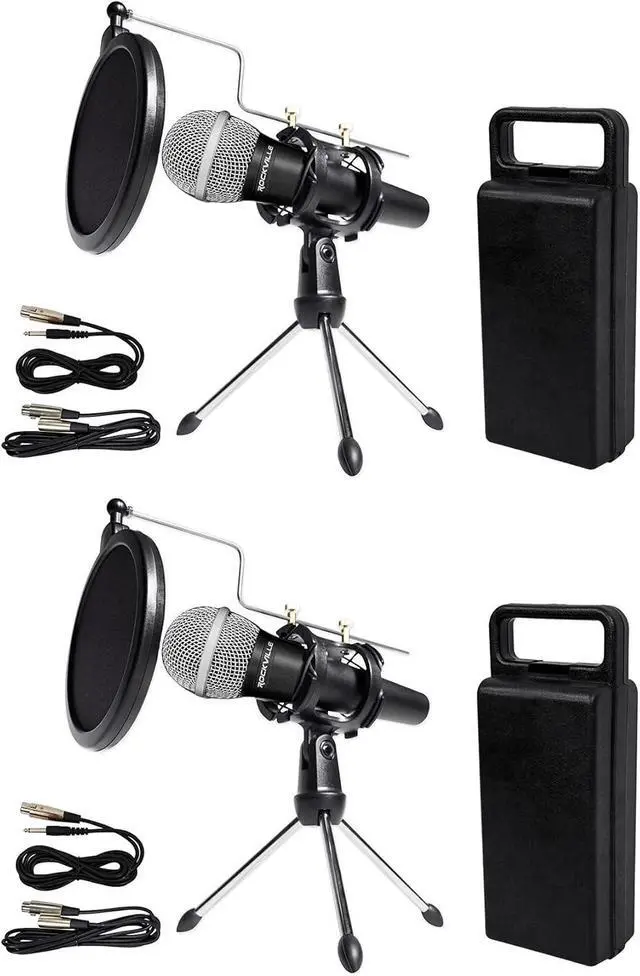 Package Includes: (2) Rockville RMC-XLR High-End Metal DJ Handheld Wired Microphone Mic w/ (2) Cables, (2) Rockville RTMS21 Desktop Tripod Dynamic Microphone Stands + Pop Filter + Shock Mount