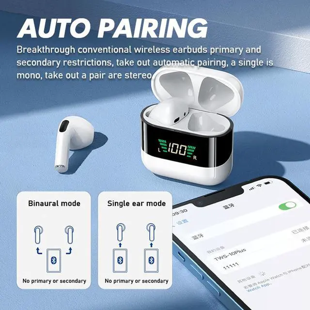 1.Open wireless earbuds charging case to automatically boot and connect to the phone,automatically shut down and charge when put earbuds into the charge case,easy to use.