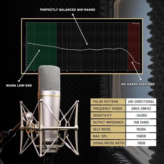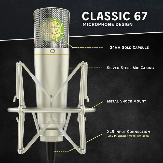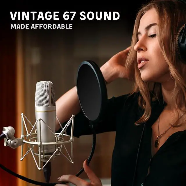 Introducing the MA-67 Studio Condenser Microphone, the perfect choice for all your music production, vocal recording, and podcasting needs. This sleek and stylish microphone features a 34mm gold large diaphragm capsule, delivering exceptional audio quality for singers, musicians, and podcasters alike. Whether youre recording vocals for a new album or conducting an interview for your latest podcast episode, this condenser microphone is designed to capture every nuance of your voice with crystal clear precision. Included with the MA-67 Studio Condenser Microphone is everything you need to get started right out of the box. The package comes complete with a hydro pop filter to eliminate unwanted plosives and breath noises, a durable metal shock mount to minimize vibrations and handling noise, a reliable XLR cable for seamless connectivity to your recording equipment, and a convenient mic bag for easy storage and transportation. With all these accessories at your disposal, youll be able to step into the recording studio fully prepared to create professional-quality recordings. Investing in high-quality recording studio equipment is essential for achieving top-notch sound production. Thats why the MA-Studio Condenser Microphone is the perfect addition to any home or professional studio setup. Whether youre looking for a microphone for singing, a condenser microphone for capturing every subtle detail of your performance, or simply seeking a reliable studio microphone with XLR connectivity, this versatile microphone has got you covered. Elevate your recordings to the next level with the MA-Studio Condenser Microphone - the ultimate choice for discerning creators.
