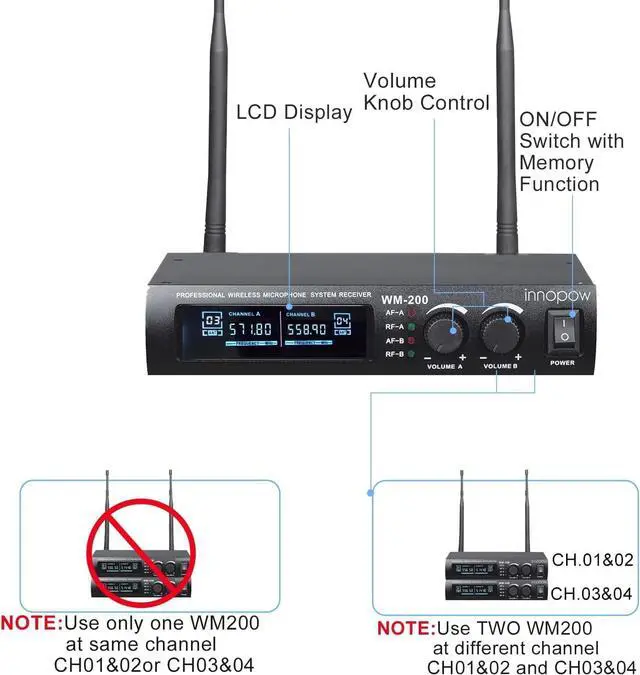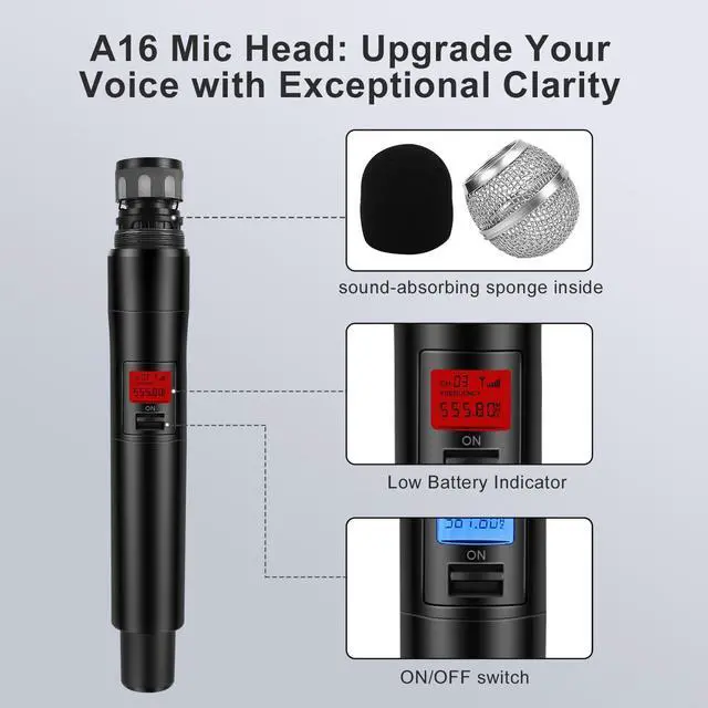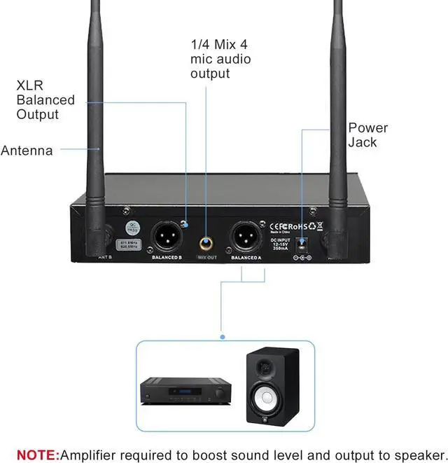 Fixed frequency, ideal for church, small DJ KJ stage, birthday wedding or family party, conference, classrooms, small karaoke night etc. Note: it don't have MUTE feature. Only support 1 mic set work at the same time. Multiple microphone sets can't work at the same place & time.