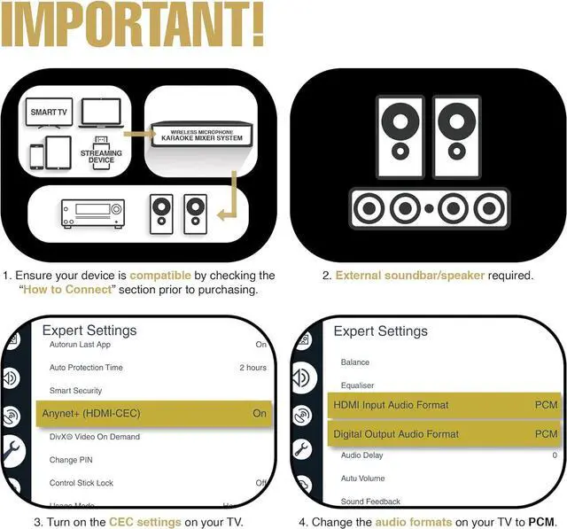 CONNECTION DIAGRAM: 1. For TV connection, refer to the Connection Instructions diagram. Enable the TVs ARC function, select PCM as the audio format, and choose external speakers in the TV settings. 2. If microphone volume is low, first increase the volume on the TV, soundbar, and receiver. Then, on the SWM16-MAX mixer, set the microphone volume knob to a low-to-mid level and raise the volume to a desired level (2030%).