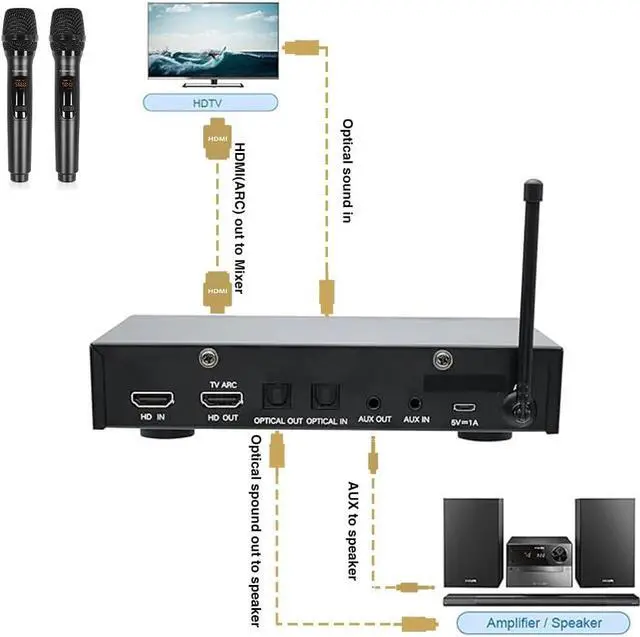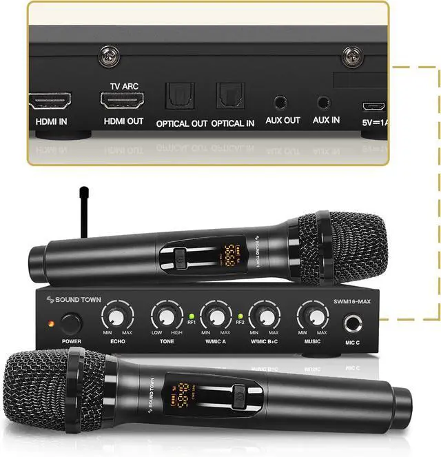FLEXIBLE CONNECTION OPTIONS: The SWM16-MAX includes two metal handheld wireless microphones, offering durability and a premium feel. It offers multiple input/output options: HDMI IN, HDMI OUT (TV ARC for audio input from a smart TV), Optical (Toslink) IN/OUT, and 3.5mm (AUX) IN/OUT, making it compatible with a wide range of devices, including smart TVs, home receivers, soundbars, and more.