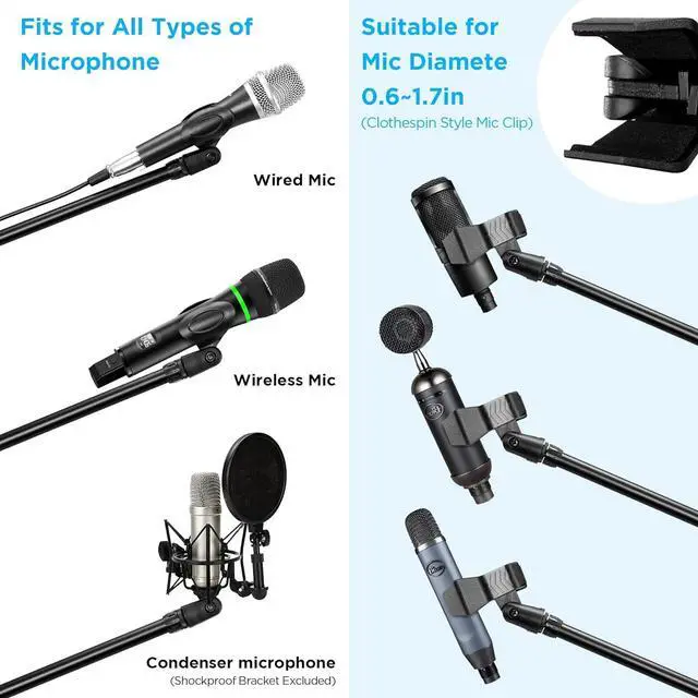 Universal Mic ClipsThe mic stand comes with 2 different styles of microphone clip holders, it can hold most of the microphones on the market. With 2 clip-on cable holders to keep the cable neatly and orderly.