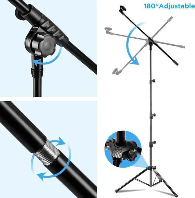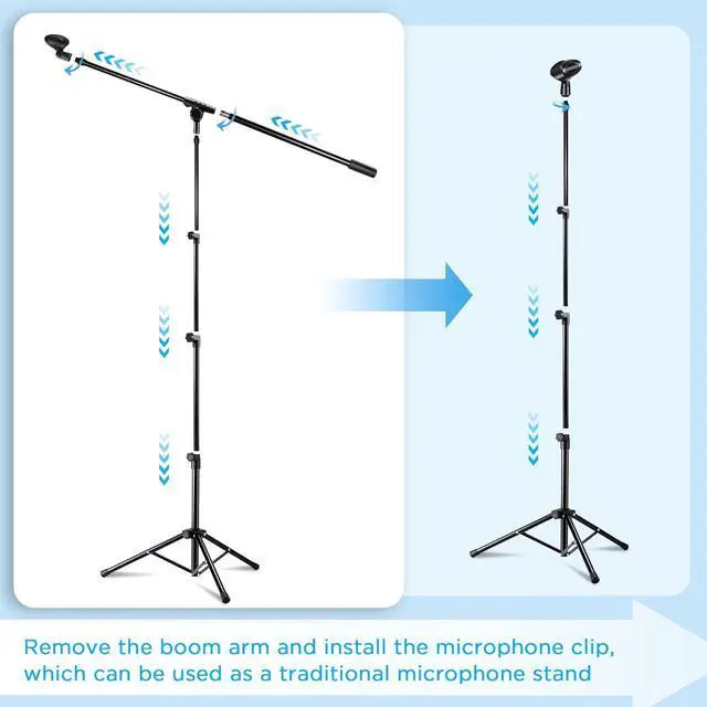 Extendable & Detachable Boom ArmThe boom arm can be 360°rotated through adjustment knobs for easy positioning. Simply remove the boom arm and attach microphone clip to convert the mic stand into a traditional straight mic stand.