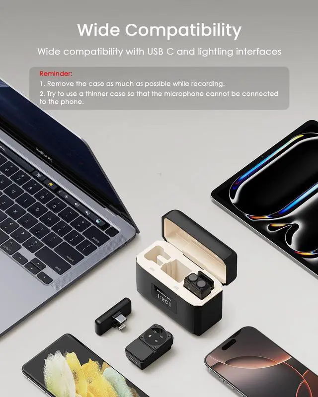 Crystal Clear Sound & Enhanced Compatibility:This wireless lavalier microphone delivers studio-quality audio with advanced noise cancellation and reverb effects. Compatible with iPhone, iPad, and USB-C devices, its the perfect mini microphone for content creators, podcasters, and professionals seeking superior sound.