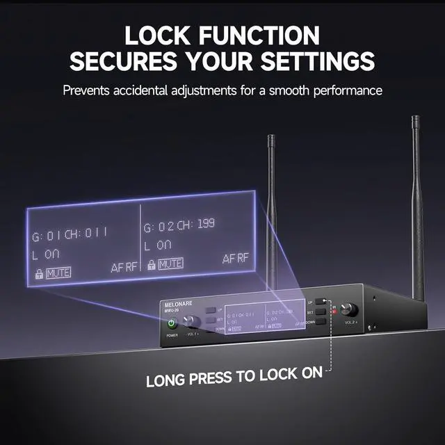 One-Tap Mute and Lock Function: Easily mute on the dynamic microphone by tapping the power button, providing convenient control on the go; Long press the UP button to initiate the lock function of the cordless mic system, keeping your performance secure and uninterrupted