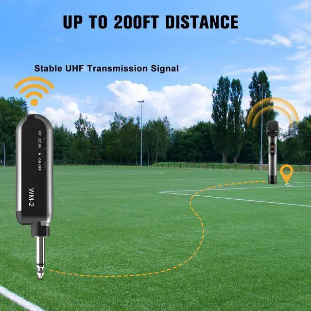 STABLE SIGNAL TRANSMISSIONThis dual-channel handheld wireless microphone set provides 15 frequency options for each channel with 200 feet stable signal distance and supports 15 sets of microphones that can be used simultaneously.