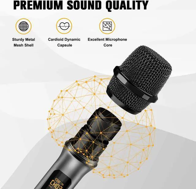 PREMIUM SOUND QUALITY Equipped with a professional chipset, this dynamic wireless microphone will reproduce clear sound without distortion. The built-in noise reduction cotton effectively reduces the noise generated during use. Ideal for singing, karaoke, party, speech, wedding, meetings, and live performances.