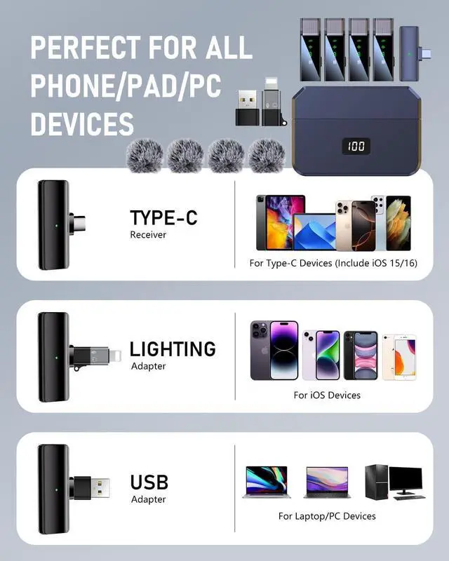 Effortless Setup and Use: Plug-and-Play Simplicity. We understand that time is of the essence, especially when inspiration strikes. Thats why the ZERFUN 4 is designed for maximum convenience. Our wireless lavalier microphone system features automatic pairing, so all you have to do is plug it into your iPhone, Android phone, or PC via the USB-C or Lightning port/USB, and youre ready to start recording in seconds. Whether youre a seasoned professional looking for a quick setup before a live broadcast or a beginner just starting out with content creation, ZERFUN 4s intuitive design makes it accessible to everyone, eliminating the need for complex technical know-how.