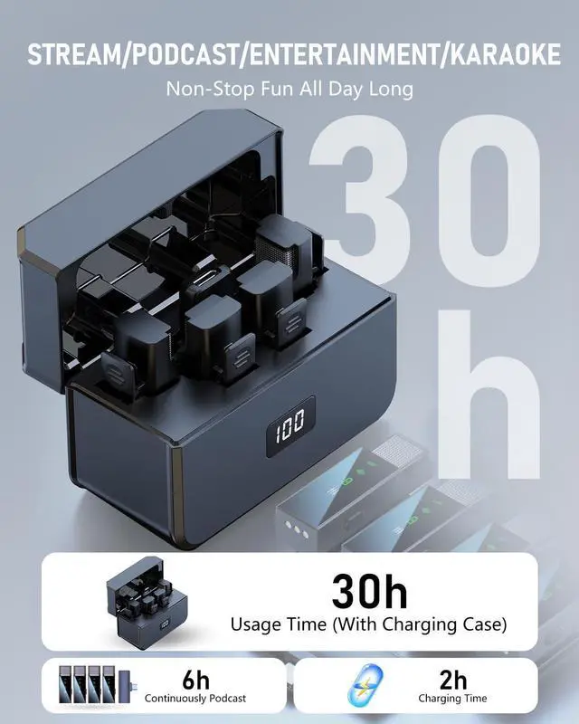 Impressive Battery Life: Power That Keeps Up with Your Creativity. Running out of battery in the middle of an important recording session is a nightmare for any content creator. The ZERFUN 4 Wireless Lavalier Microphone System puts those concerns to rest with its outstanding battery performance. You can enjoy up to 30 hours of continuous usage with the included charging case, making it perfect for long shoots, multi-day events, or extended podcasting sessions. Even without the charging case, the microphone offers 6 hours of non-stop podcasting, more than enough for most standard recording needs. And when the battery does run low, a quick 2-hour charge gets it fully powered up again.