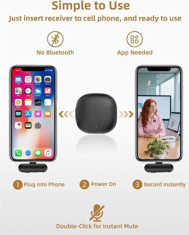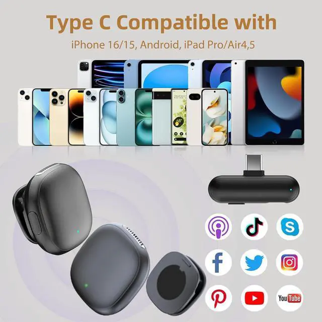Phone Microphone for iPhone 16: simply plug the receiver into your cellphone, turn on the mini mic. No Bluetooth, No extra settings. The wireless lapel microphone USB C compatible with iPhone 15 16 17 Android etc. With USB adapter, you can turn it to be a cordless AI microphone for computer, laptop, PC