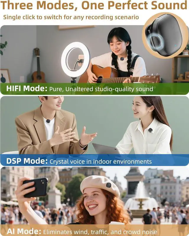 Microphone for Content Creators: Unlock unparalleled original audio clarity with our Hi-Fi mode (green light). Thanks to the Gen 2 AI noise cancellation chip, you can confidently capture pristine audio even in bustling crowds, windy, noisy outdoors. Transform any location into your personal studio and effortlessly create captivating voice and video content that stands out