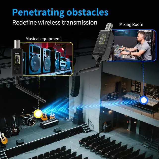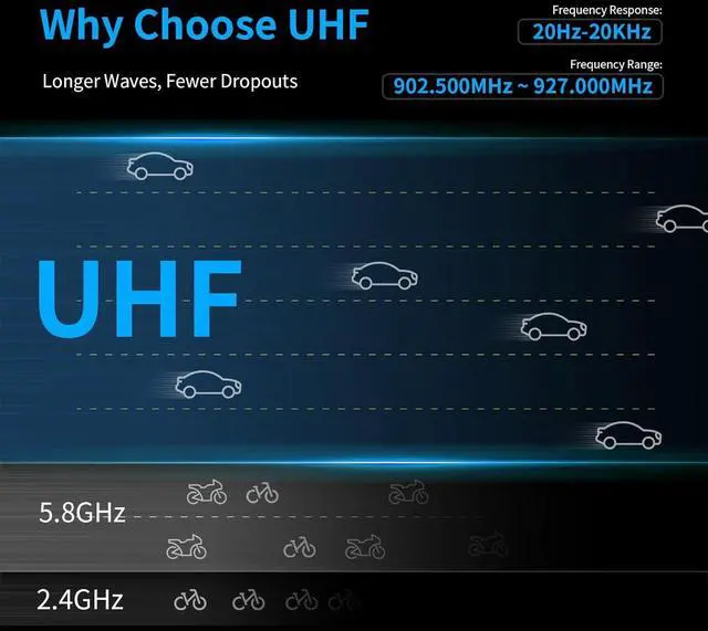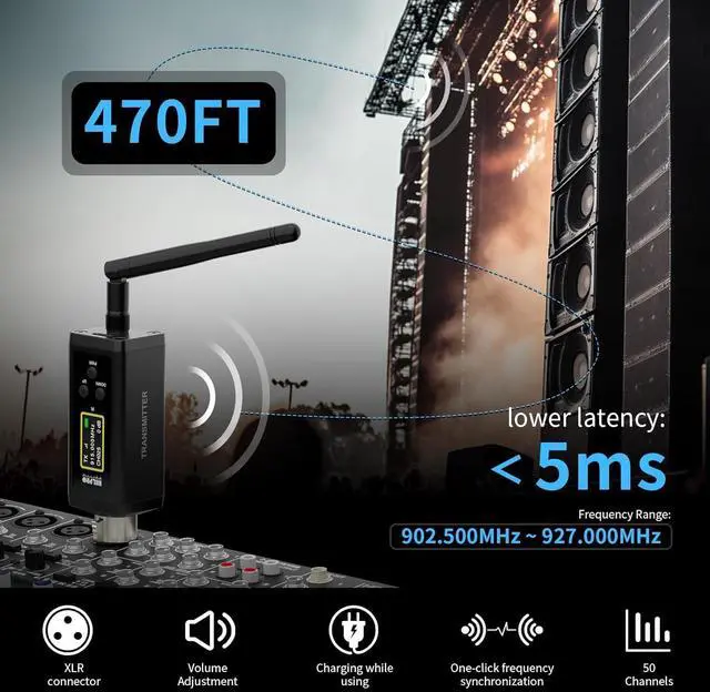 UHF & 475 ft Transmission DistanceUp to 475 feet wireless transmission distance, offering an larger space for outdoor mobile performance or live event. Ultra-high-frequency UHF technology and less than 5ms latency