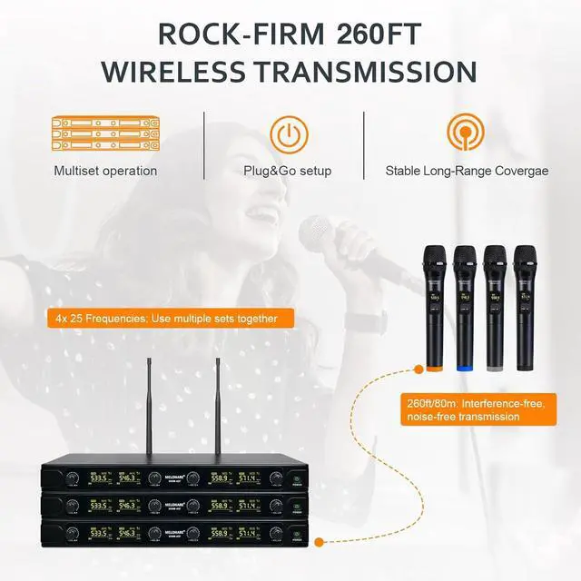 CONSISTENT WIRELESS TRANSMISSION: Operating on a UHF 530-580MHz frequency range, the wireless microphone system ensures stable and interference-free signal transmission. With 4x25 frequency groups, the cordless microphone effectively avoids cross-frequency interference and supports seamless multiset operation. The wireless mic set offers a long range of up to 260 ft/80 m that allows you to move freely around the stage, enabling consistent performance throughout the event