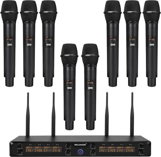 BOX CONTENTS: This microfono inalambrico set comes fully equipped with everything you need for a seamless experience, including a wireless receiver, 8 handheld microphones, and 16 AA batteries for immediate use. The package also includes a power adapter, a 1/4" audio cable, and a 6.35mm to 3.5mm cable adapter, ensuring versatile connectivity options. With the user manual provided, setting up your system is quick and hassle-free