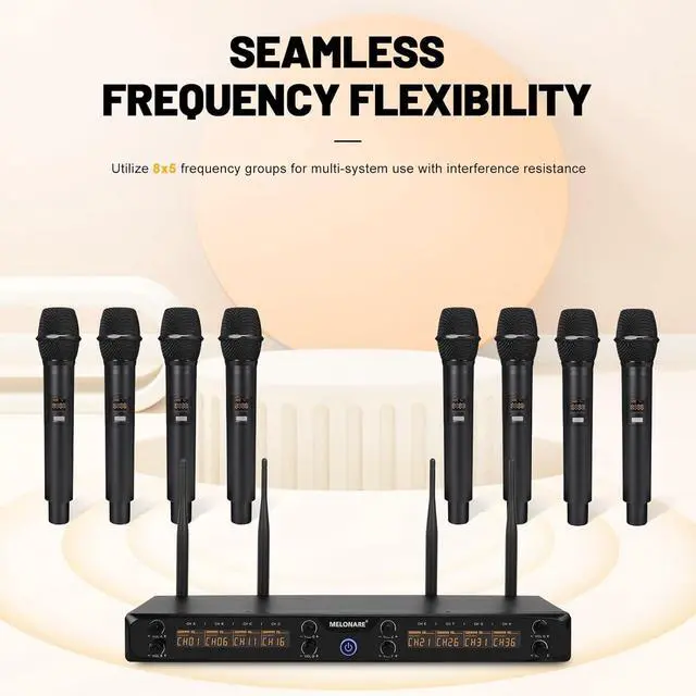 SEAMLESS WIRELESS CONNECTIVITY: Benefit from expansive 240 ft coverage with UHF 500 MHz signal clarity, the microphone possesses an excellent wireless performance. With frequency hopping, our microphone wireless enables the selection of clear frequencies free from interference, ensuring smooth wireless transmission even in complex scences. Meanwhile, its 8x5 frequency groups support the simultaneous use of multiple systems up to 2 sets, providing exceptional convenience for extensive setups.