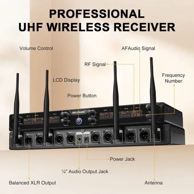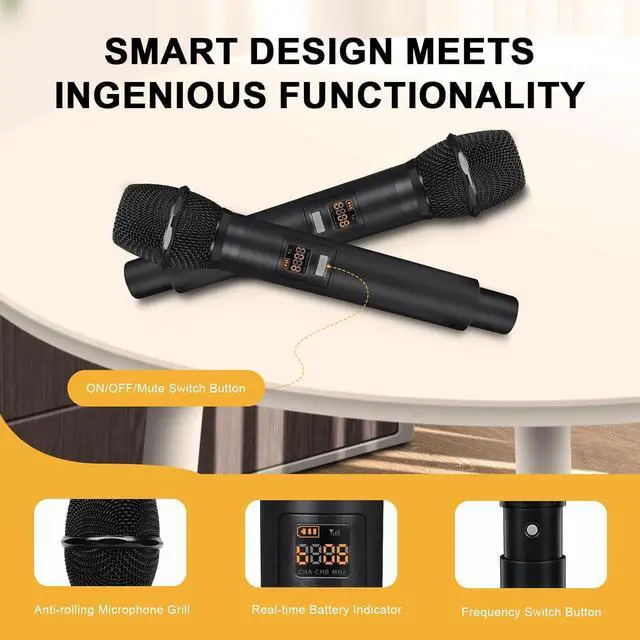 USER-FRIENDLY DESIGN: The dynamic handheld microphones feature a diamond-edged design that prevents rolling, keeping them securely in place on any surface. The main units clear screen display prominently shows channel assignments, making it easy to identify and switch between channels. This thoughtful design of the microphone system ensures a seamless, stress-free experience, allowing you to focus entirely on your performance