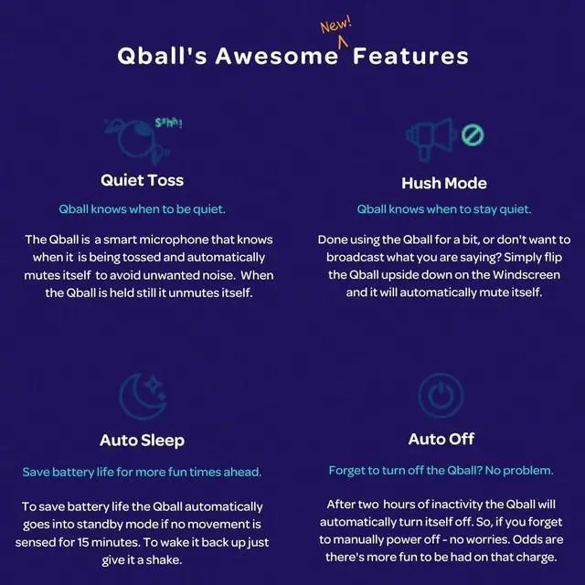 Soft and Durable Range - 75 ft from receiver 12+ hours of talk time Quiet Toss - Mutes when the ball is in motion Light Ring Indicator Auto Sleep Great for classrooms, conferences, or meetings