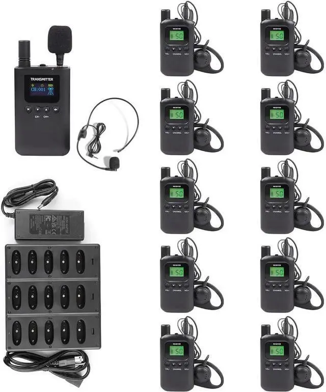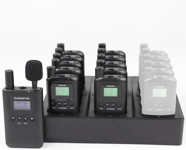 The working range between the transmitter and receivers is 150-180 meters / 165-200 yard in sight. No matter it is a small tour group or large conference, these devices will work in a satisfactory way.