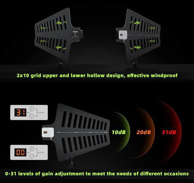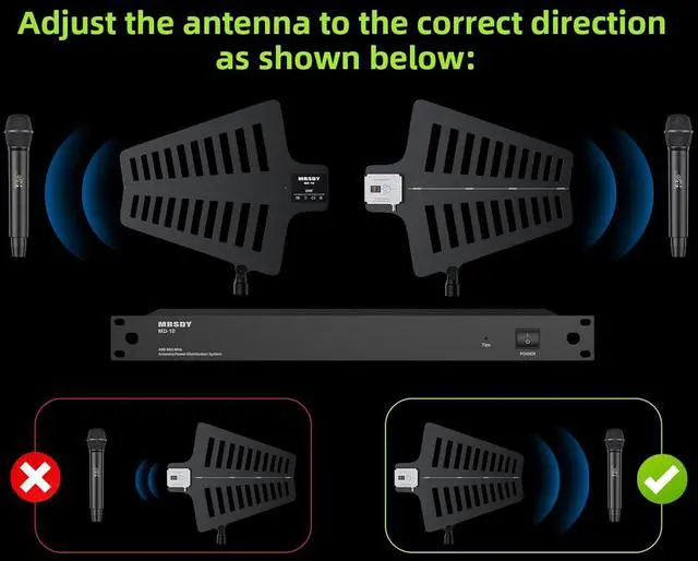 DIRECTIONAL ANTENNA PADDLE The antennas has a unique exhaust air design, very easily mounted on stands or walls without fall. 360° perfect receiver signal, coverage every angle, microphone transmission is more stable. Have 0-31tap position gain adjustment to compensate for different situation signal loss. Signal reception distance up to 2200 ft.