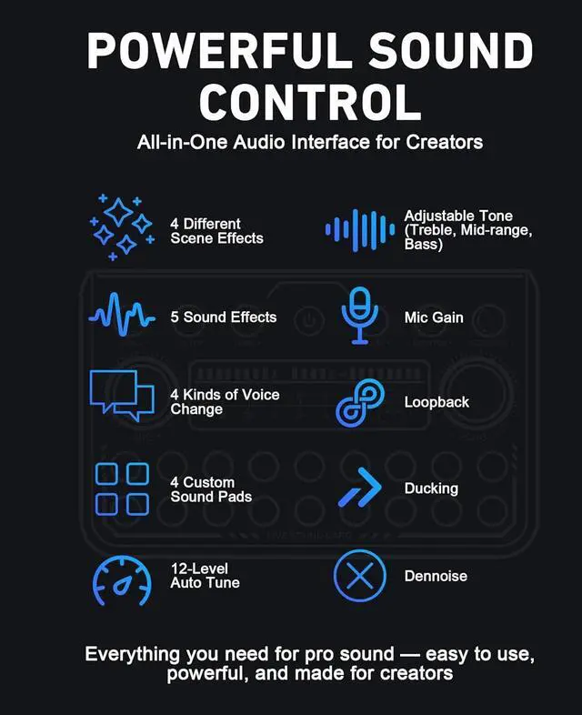 [Versatile Soundboard with FX & Voice Modulation] The included podcast mixer provides professional features to enhance streams or recordings: 4 customizable sound pads, 4 ambient modes, 4 voice-changing modes, 5 scene effects, music-only mode, denoise, loopback, auto-tune, and adjustable EQ. Add personality to your content and make streaming, recording, and voiceovers more professional and fun.