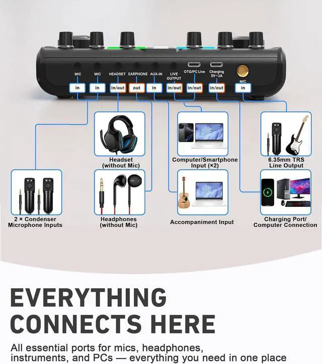 [Important Tips & Customer Support] Please fully charge the sound mixer before first use to ensure optimal performance. For any issues, our dedicated customer support team is available 24/7 to assist you quickly and professionally. Fast help for all podcasting and streaming needs.