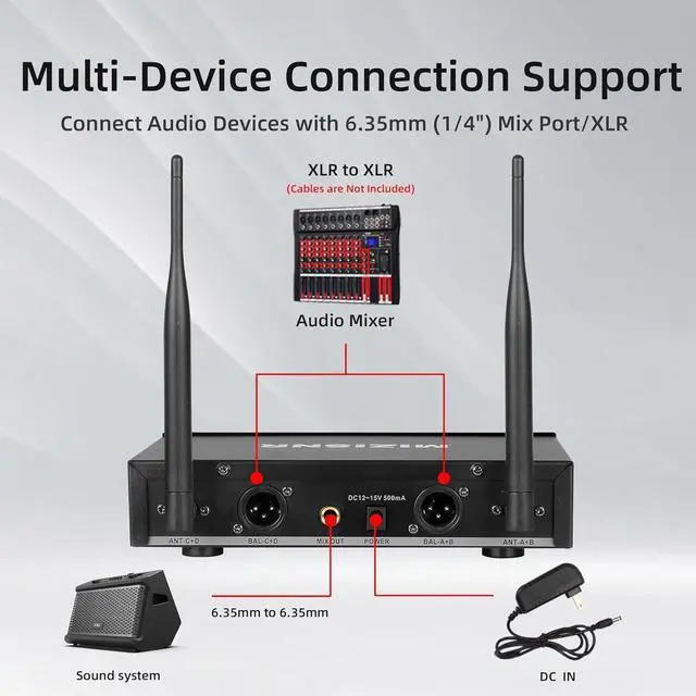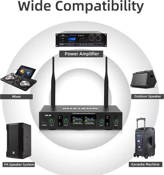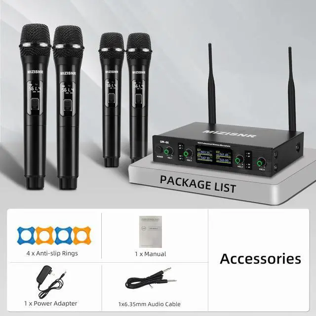 PACKAGE LIST: 1 x UHF wireless receiver, 4 x UHF wireless microphones, 1 x power adapter, 1 x 6.35mm audio cable, and 1 x user manual. Please don't hesitate to contact us if you have any questions or concerns. We will provide satisfactory solutions within 24 hours.