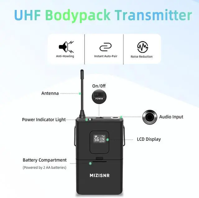 EASY TO USE: Simply turn on the receiver, insert 2 AA batteries (not included) into each bodypack transmitter, and then turn on the bodypack transmitter. They will automatically synchronize. The included 1/4" (6.35mm) audio cable makes our receiver compatible with audio amplifiers, TVs, home theater systems, and stage speakers.