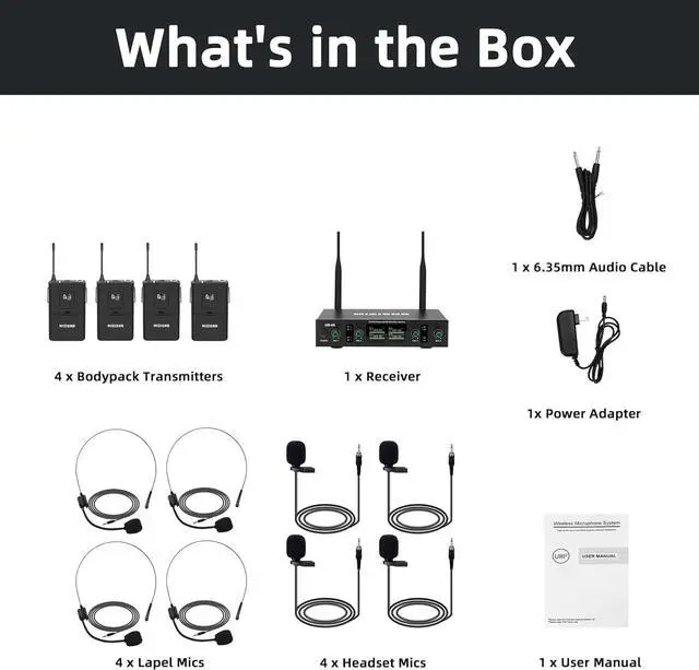 PACKAGE LIST: 1 x receiver, 4 x Bodypack Transmitters, 4 x Headset Mics, 4 x Lapel Mics, 1 x 6.35mm audio cable, 1 x power adapter, and 1 x user manual. (Warm Tips: For the best performance with our high-sensitivity mic, we recommend keeping volume at 80% to ensure clear audio and avoid feedback.)