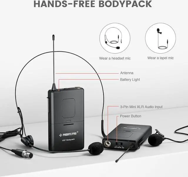 VERSATILE USE: Easy setup wireless microphone system and convenient operation with ON/MUTE/OFF switch on both cordless mic and bodypack. Metal receiver features 2 XLR outputs and one 1/4 audio output jack to connect to your amplifier, mixer, or other PA system. Equipped with handheld mic, wireless headset mic, and wireless lavalier mic in one package for more flexibility