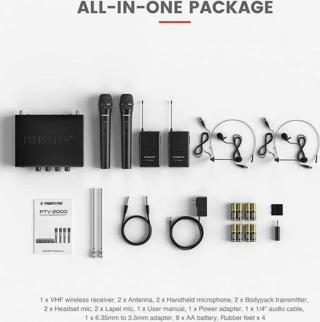 BOX CONTENTS: 1 x 4-channel receiver, 2 x handheld mics, 2 x VHF bodypacks, 2 x headset mics, 2 x lapel mics, 1 x 1/4 audio cable, 1 x power adapter, 1 x user manual, 8 x AA batteries, 1 x 6.5mm to 3.5mm adapter
