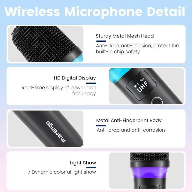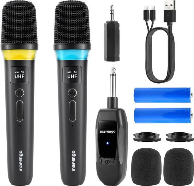 Dynamic LED DesignThis Marengo handheld wireless microphones is made of fingerprint-resistant body material, built-in multi-color LED light show. Specially designed for karaoke parties and live performances.