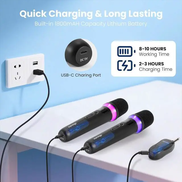 Rechargeable Wireless MicrophonesRechargeable Cordless microphone and receiver feature built-in 1800mAh rechargeable batteries, use USB-C charging port for charging, only 2-3 hours charging, karaoke microphone wireless can achieve 8-10 hours of continuous use. Say goodbye to constant battery buying!