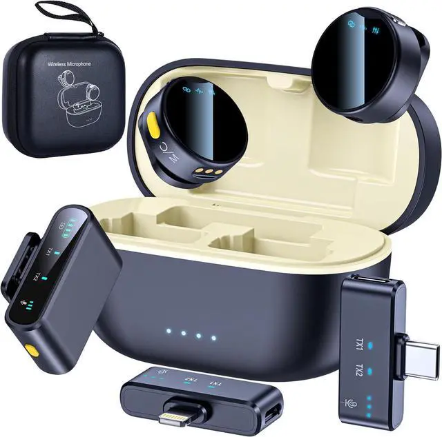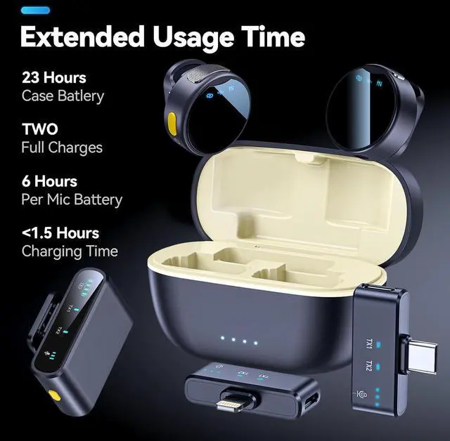 Battery Life of Over 24 HoursThe wireless lavalier microphone provides 6 hours of battery life, which can be used continuously for over 24 hours with the intelligent charging compartment. You can easily monitor the battery status through the LED display screen, so that your day's work is not delayed. Note: The camera interface needs to be charged separately, and we provide a dual head charging cable that allows you to charge both the charging case and the camera interface simultaneously.