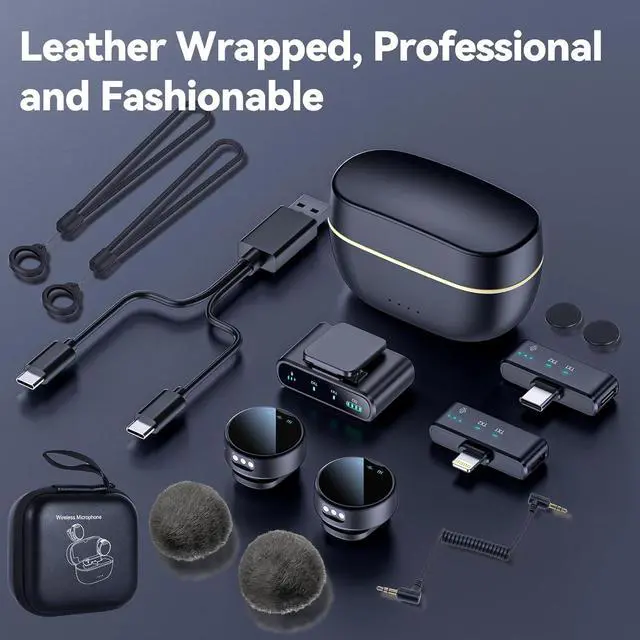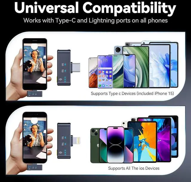 Plug and play convenienceWe provide two version. 1) For Phone version: Use a wireless lapel microphone compatible with Lightning and Type-C interfaces, Automatic pairing and lightning fast 1-second connections mean more time recording and less time tampering; 2) For Phone+Camera Version: On the basis of the mobile version, a camera interface is added. When connected to the camera through a 3.5mm audio jack, the reverberation function provides 3D sound and immersive feeling. Note: The camera interface needs to be charged separately, and we provide a dual head charging cable that allows you to charge both the charging case and the camera interface simultaneously.