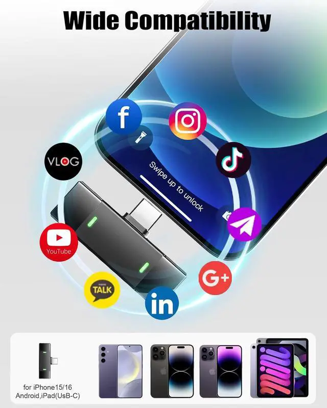 USB-C Ready: Truly Plug & PlayDesigned for modern devices. The receiver plugs directly into USB-C portsno adapters or Bluetooth pairing required. Fully compatible with the latest Android phones, iPhone 15/16/17 series, iPad Pro/Air, and most laptops. Enjoy a pure, stable connection every time with this versatile mic for iPhone and other USB-C devices.