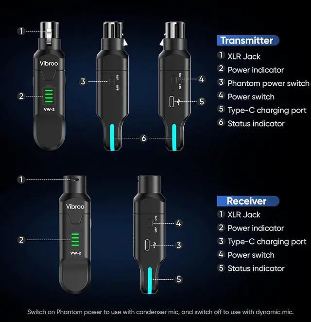 - : Enjoy Hi-Fi audio with 24-bit/48kHz resolution, ultra-low latency (<5ms), and a wide dynamic range. Perfect for dynamic/condenser microphone this wireless XLR transmitter and receiver. Please turn on the Phantom power if you use condenser mic, while no need to do so when moving-coil mic.