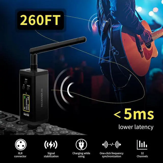 UHF & 260FT Transmission Distance: Employing advanced UHF wireless transmission technology, the wireless guitar system offers an effective transmission range of up to 260 feet. Ensure a high-quality wireless transmission experience with low latency,low noise,and lossless audio quality