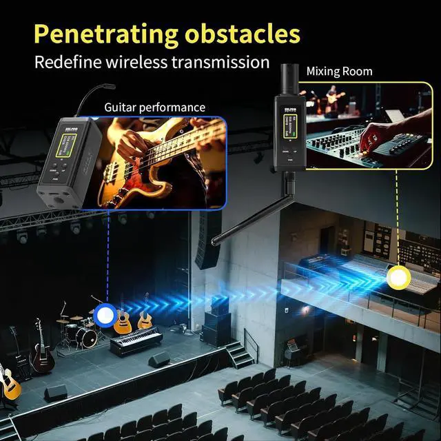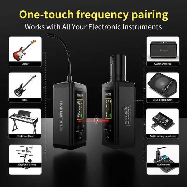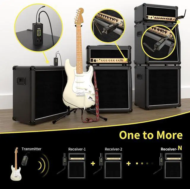 Built-in 32 Channels & One-to-More:The wireless guitar system supports 32 sets of transmitters and receivers working simultaneously.Also allows one transmitter to match multiple receivers,making it suitable for gig, rehearsal or live performances involving multiple performers